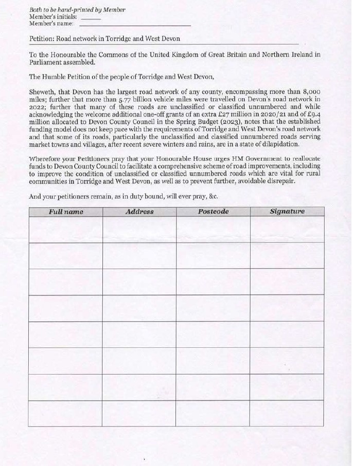 Please find below a link to the document that can be printed and signed. Please share this with your community. If you would like a hard copy please contact the Parish Clerk on broadwoodwidgercouncil@outlook.com or 07305189929. Completed forms can be collected by the Parish Clerk to return to the House of Commons or sent directly using the address House of Commons, London, SW1A 0AA